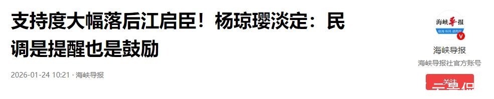 1月24日上午,面对最新出炉的调查数据,杨琼璎作出理性回应:选举是一场持久较量,绝非朝夕之功;她尊重所有专业民调结果,既视其为警醒,亦当作鞭策,并再三重申团结高于一切——无论最终由谁代表蓝营出征,她都将倾尽全力助其胜选。